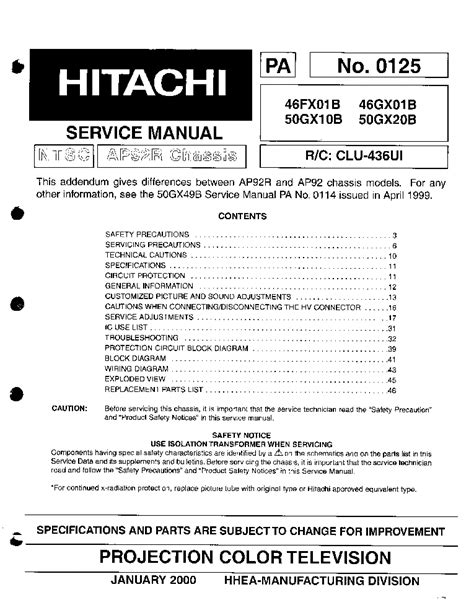 At present you are looking for an Service Manual Hitachi 46gx01b Projection Color Television example of which we provide here in some type of document formats many of these as PDF, Doc, Energy Point, and in addition images of which will make it easier for you to create an Service Manual Hitachi 46gx01b Projection Color Television yourself. For a more clear look, you may open some examples below. All of the examples about Service Manual Hitachi 46gx01b Projection Color Television on this site, we get from a number of sources so you can create a better document of your own.